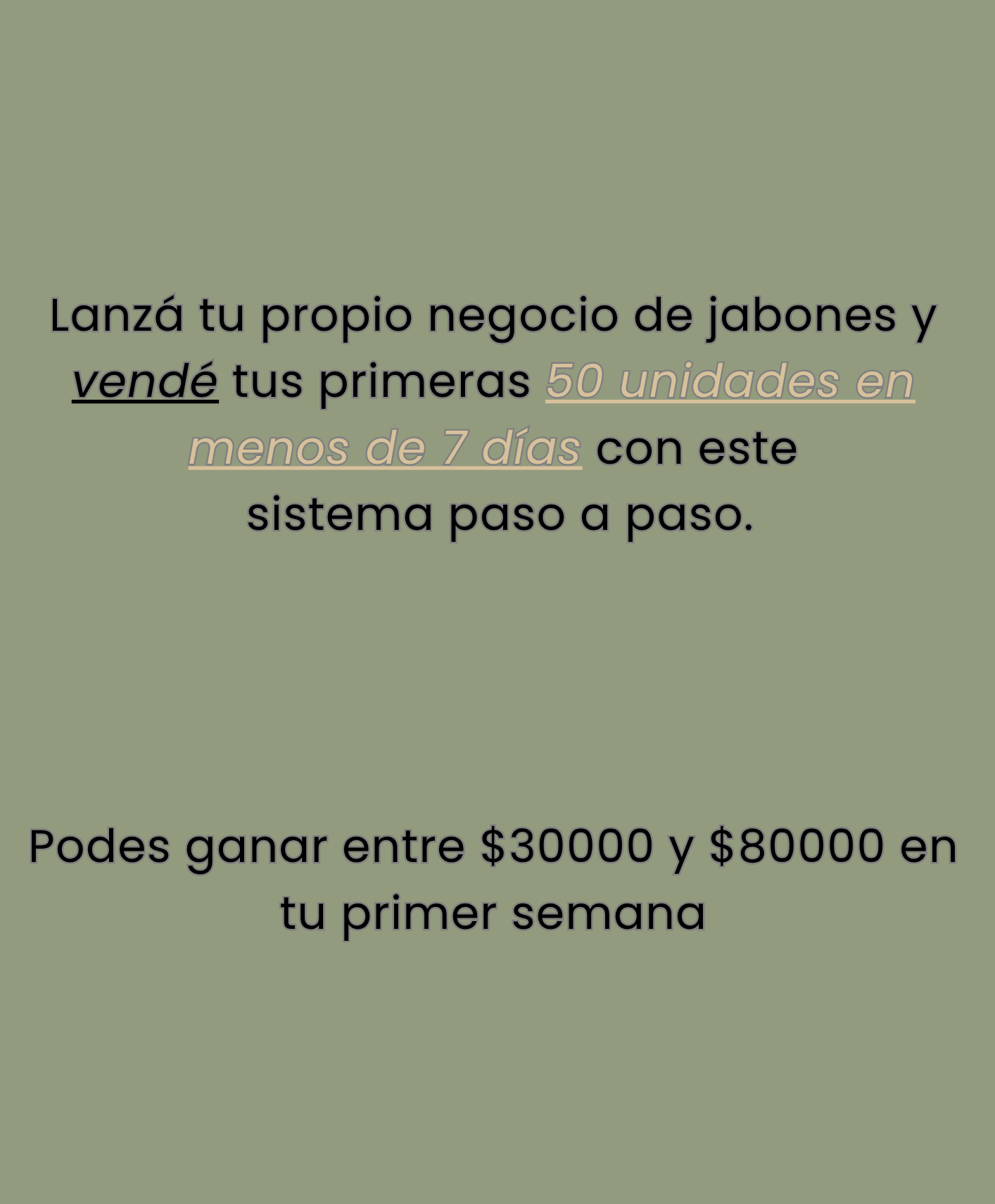 Depende de tu ritmo, pero con las fórmulas y estrategias del e-book, podés vender tus primeros 50 jabones en 10 días y genera entre $50.000 y $80.000 de ganancia.